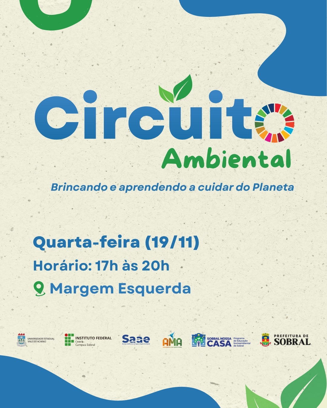 A Prefeitura de Sobral, por meio da Secretaria do Urbanismo, Habitação e Meio Ambiente (Seuma), realizará na próxima quarta-feira (19/11), das 17h às 20h, o “Circuito Ambiental” Itinerante na Margem Esquerda. A ação é aberta ao público e reúne uma programação diversa, voltada à educação ambiental, cultura, lazer e serviços para a