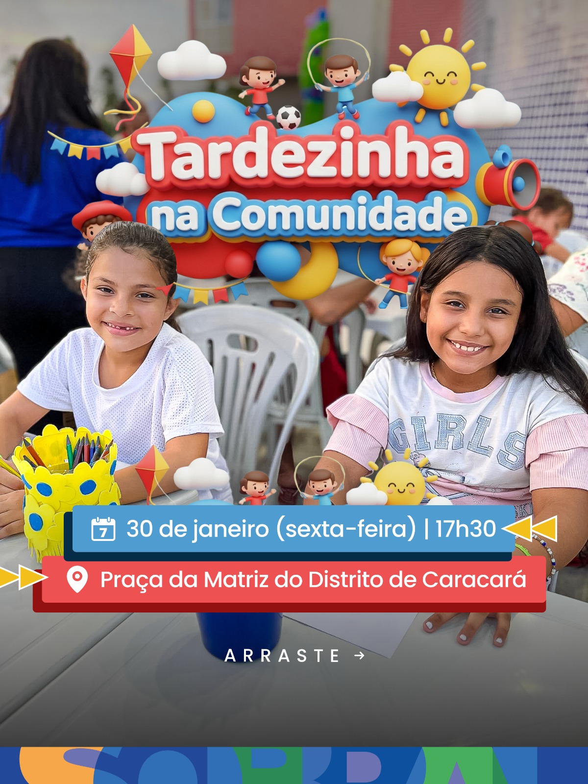 A Prefeitura de Sobral, por meio da Secretaria do Esporte e Lazer (Sespol), realizará nesta sexta-feira (30/01), a 1ª edição do Tardezinha na Comunidade 2026, no distrito de Caracará. A ação acontece a partir das 17h, na Praça da Matriz, para toda a população. A iniciativa tem como objetivo levar lazer, esporte, cidadania e serviços essenciais para crianças e famílias, promovendo integração social e bem-estar para a comunidade.