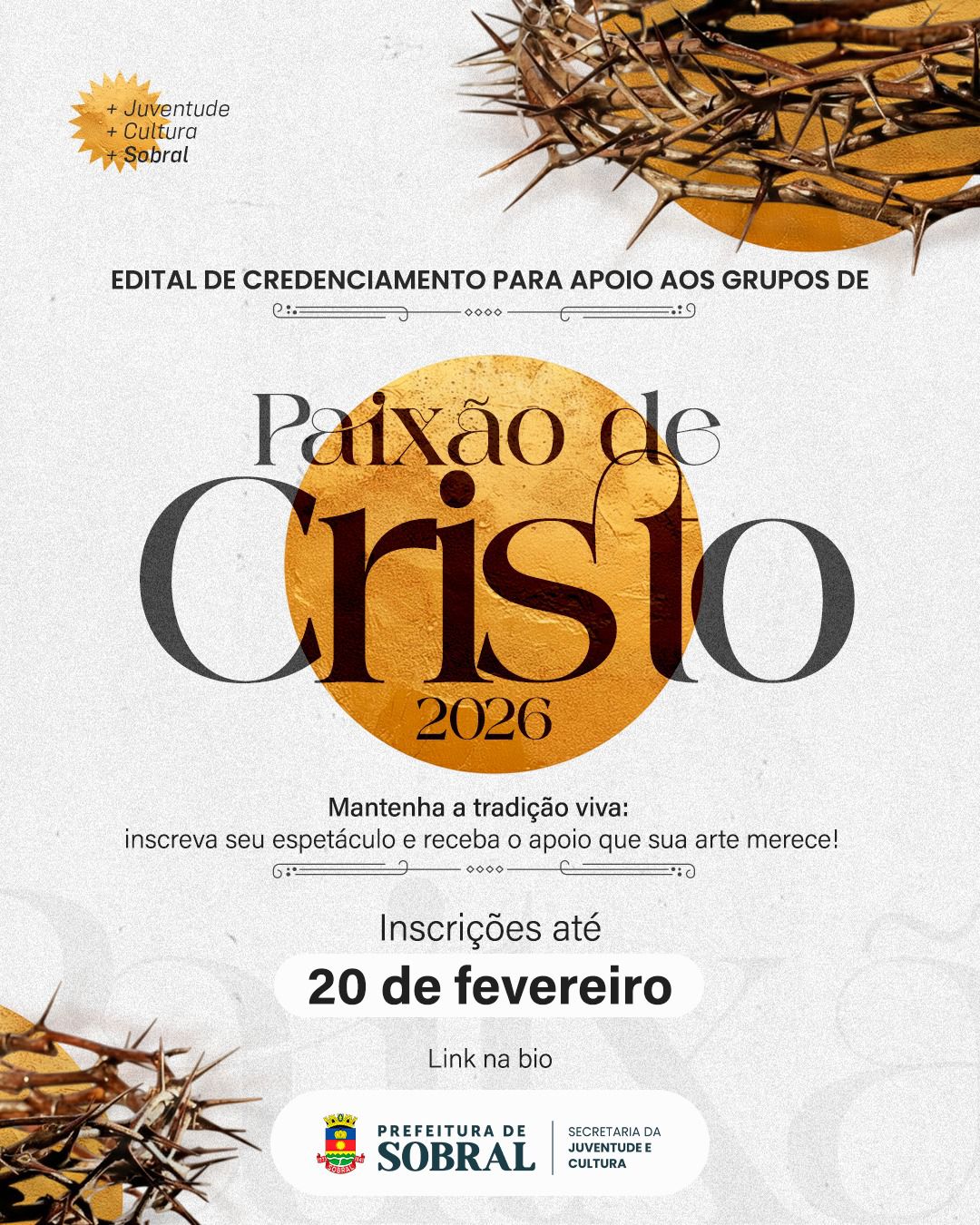 A Secretaria da Juventude e Cultura de Sobral, vinculada à Prefeitura de Sobral, torna público o Edital de Credenciamento de Grupos de Paixão de Cristo que irão compor a programação oficial dos espetáculos cênicos da Semana Santa 2026 no município de Sobral.