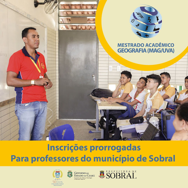 A Universidade Estadual Vale de Acaraú (UVA) prorrogou as inscrições do processo seletivo para o Mestrado Acadêmico em Geografia. Agora, os professores da rede municipal de Sobral têm até o dia 19 de novembro para realizarem a inscrição. Em convênio firmado com a Universidade, a Secretaria da Educação de Sobral garantiu a concessão de vagas para os professores efetivos das áreas de Geografia, Pedagogia, História, Filosofia e Sociologia.