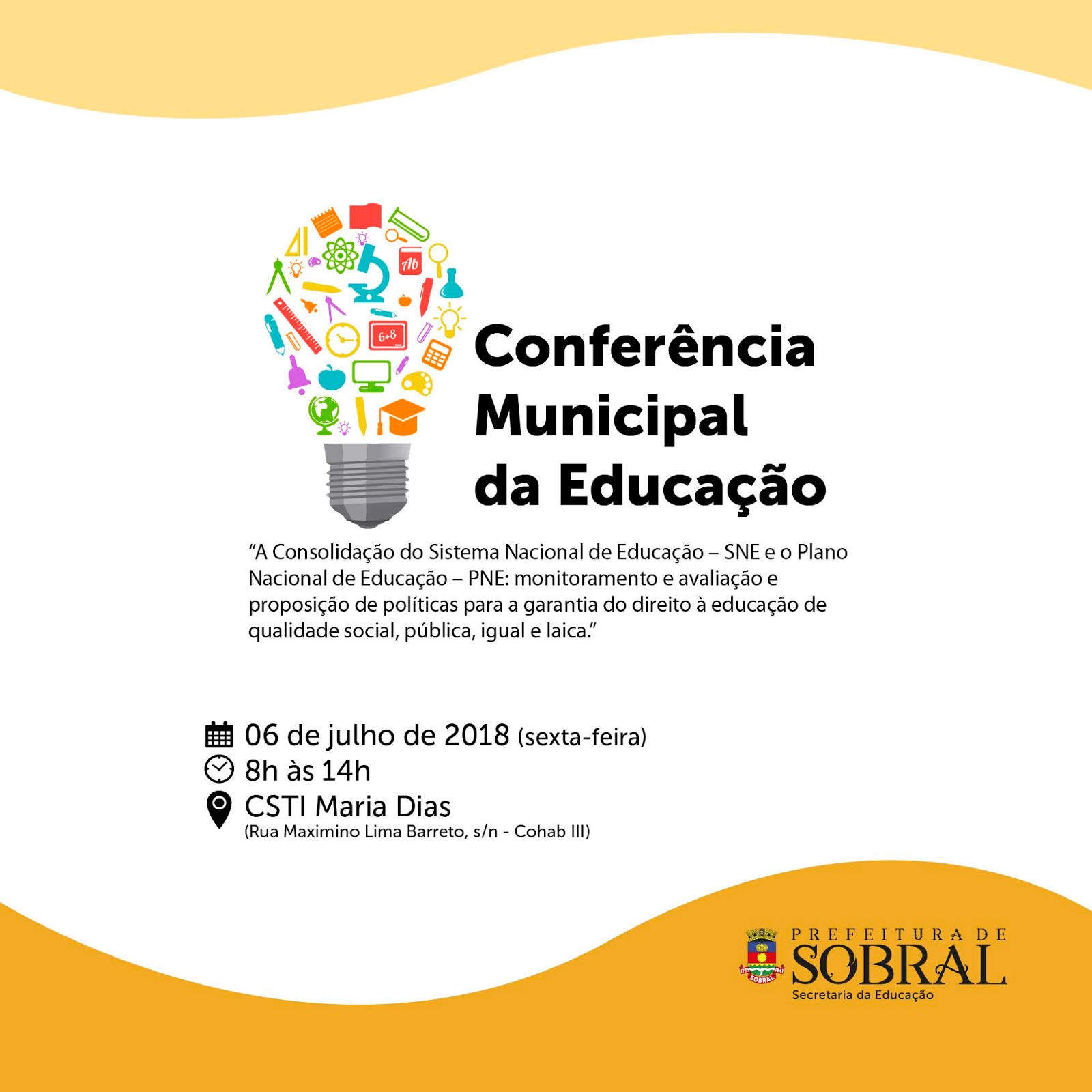 A Secretaria da Educação de sobral promoverá, na sexta-feira (06/07), das 8h às 14h, a Conferência Municipal da Educação, no Colégio Sobralense de Tempo Integral Maria Dias Ibiapina, na Cohab III. O evento reunirá gestores, professores, trabalhadores, estudantes e pais da Educação Básica, Educação profissional e tecnológica e educação superior e movimentos sociais.