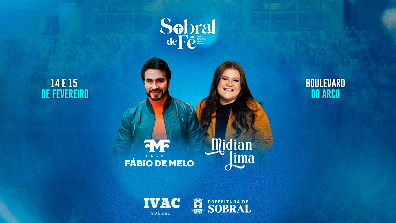 A segunda edição do Sobral de Fé acontecerá nos dias 14 e 15 de fevereiro, no Arco de Nossa Senhora de Fátima, tendo como atrações principais o padre Fábio de Melo e a cantora Midian Lima. O evento cristão, realizado no período de Carnaval, contará com atividades católicas e evangélicas, reunindo música, cultura, fé, reflexão e lazer. A expectativa é de um