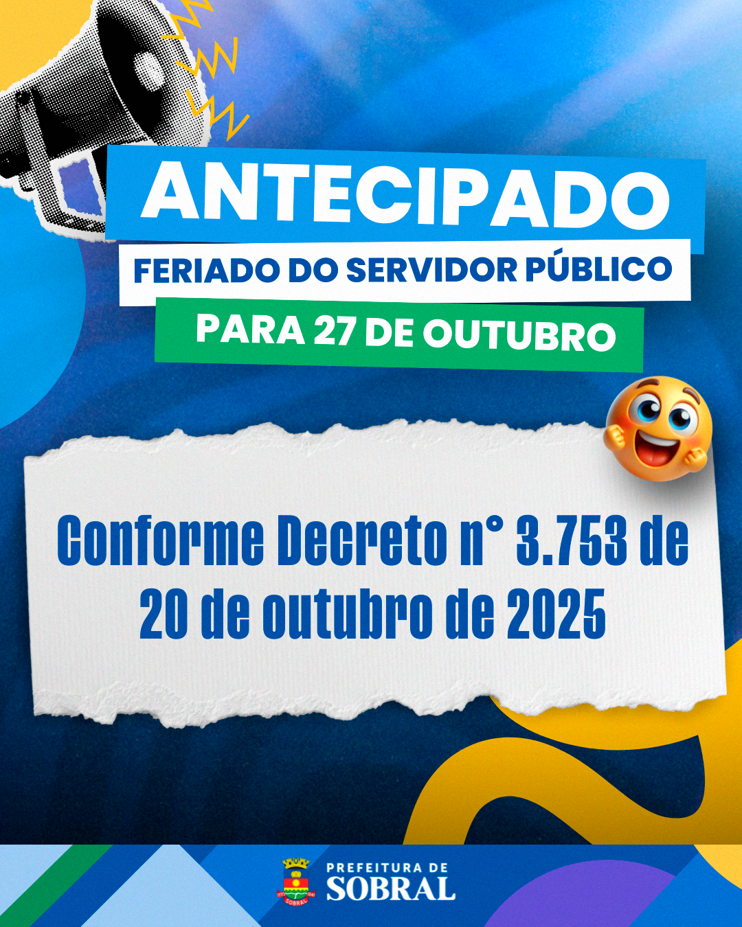 A Prefeitura de Sobral informa que o feriado alusivo ao Dia do Servidor Público, tradicionalmente comemorado em 28 de outubro, será antecipado para segunda-feira, dia 27 de outubro de 2025, conforme estabelece o Decreto Municipal nº 3.753/2025.