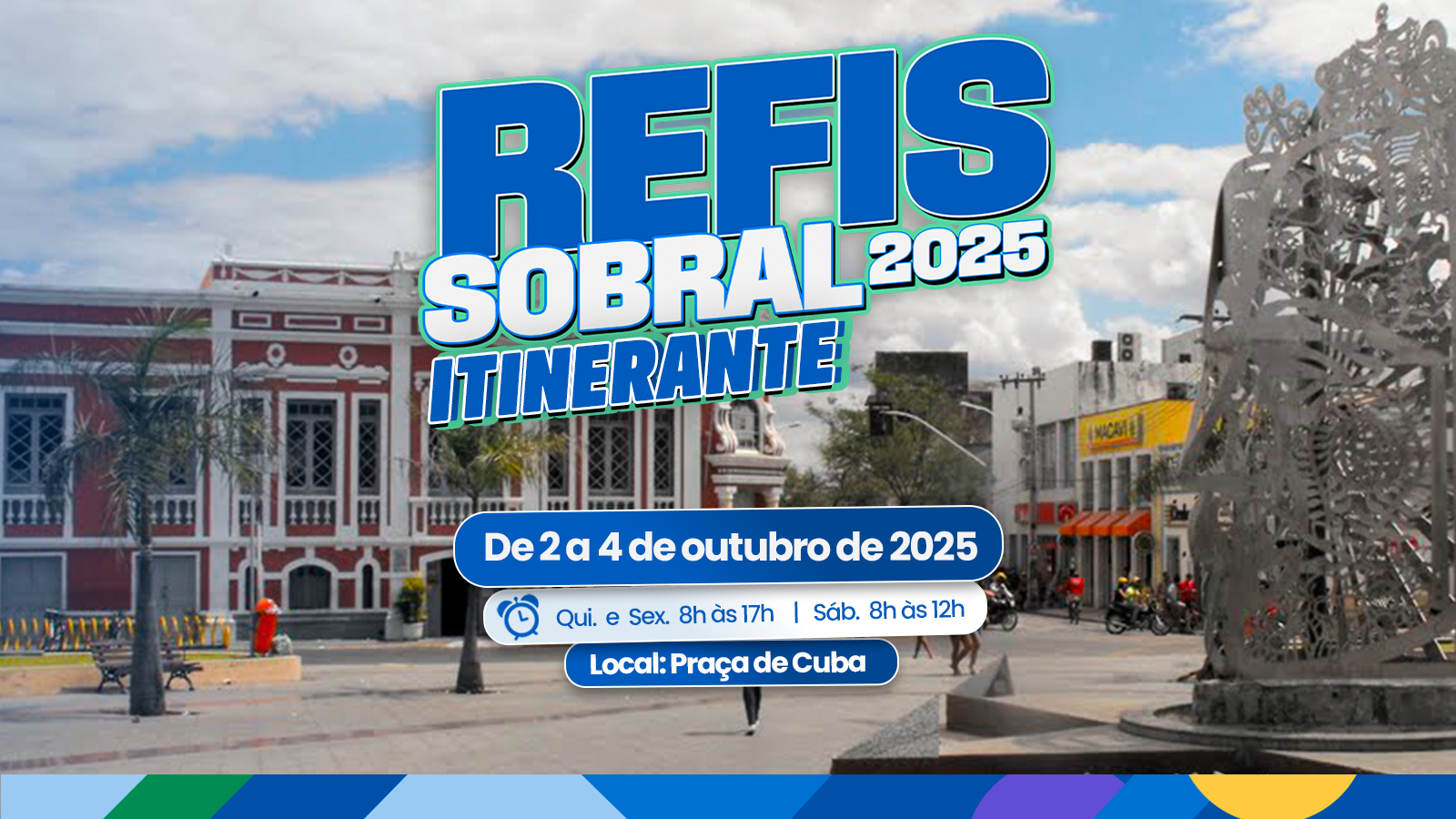 A Prefeitura de Sobral, por meio da Secretaria das Finanças (Sefin) e da Agência Municipal do Meio Ambiente (AMA), realiza, de 2 a 4 de outubro, mais uma edição do REFIS Itinerante, desta vez na Praça de Cuba, no Centro da cidade. A iniciativa tem como objetivo facilitar o acesso dos contribuintes ao programa de refinanciamento de dívidas, oferecendo condições especiais para quitação de débitos com a administração pública e obrigações tributárias.