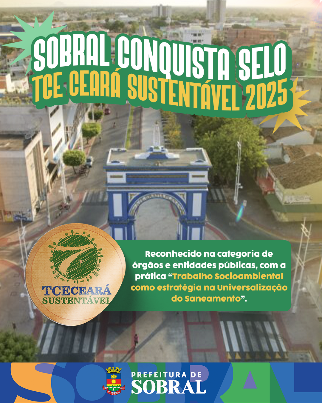 A Prefeitura de Sobral, por meio da Secretaria do Urbanismo, Habitação e Meio Ambiente (Seuma), foi classificada para receber o Selo TCE Ceará Sustentável – Edição 2025, na categoria de órgãos e entidades públicas, com a prática “Trabalho Socioambiental como estratégia na Universalização do Saneamento”.