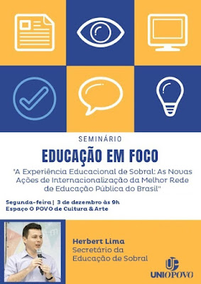O secretário da Educação de Sobral, Herbert Lima, participa do Seminário Educação em Foco, na segunda-feira (03/12), no Espaço O POVO de Cultura e Arte, em Fortaleza. Na ocasião, o gestor ministra a palestra "A Experiência Educacional de Sobral: As novas ações de internacionalização da melhor Rede de Educação Pública do Brasil", na qual ele apresenta a política de ensino e as novas iniciativas educacionais de Sobral como, a inauguração dos Laboratórios FabLearn e a participação dos estudantes no Programa Internacional de Avaliação de Estudantes – PISA for Schools.