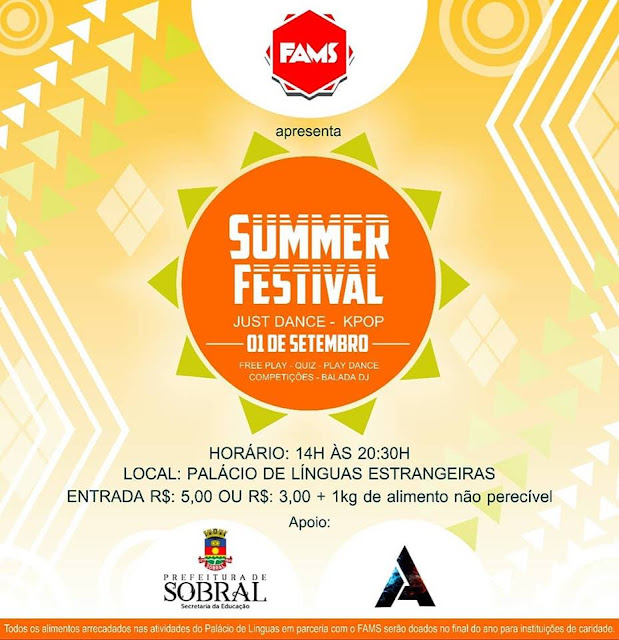 O Palácio de Ciências e Línguas Estrangeiras recebe, no dia 1° de setembro, a partir das 14h, o Summer Festival. O evento é promovido pelo Festival de Anime e Mangá Sobralense (FAMS) com o apoio da Secretaria da Educação de Sobral e tem como objetivo divulgar a cultura nerd e geek.