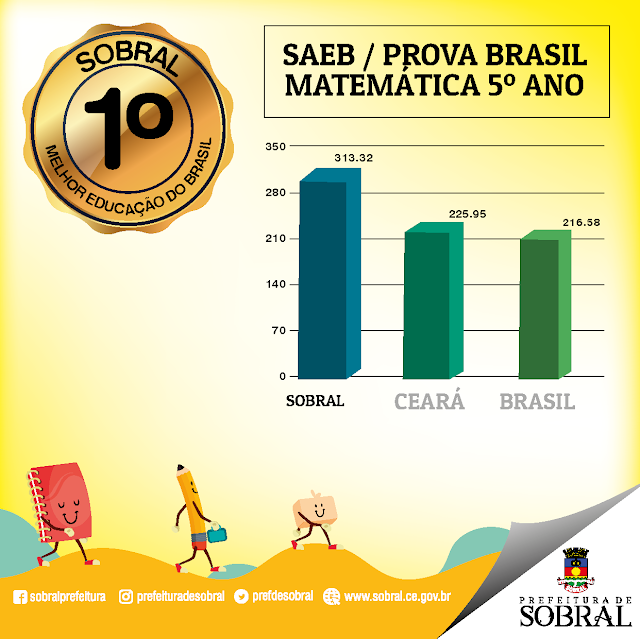 Os estudantes das escolas municipais de Sobral conquistaram avanços na aprendizagem em todas as etapas e áreas do conhecimento, quando se compara as edições de 2017 e 2015. O município registrou as maiores proficiências médias do Brasil em Língua Portuguesa (285,45) e Matemática (313,32), na avaliação da aprendizagem dos estudantes do 5º ano do Ensino Fundamental, resultado superior à média nacional que foi de 207,13 e 216,58, respectivamente. Sobral também conquistou a maior proficiência em Matemática (329,07) no 9º ano do Ensino Fundamental, acima da média brasileira que foi de 246,56.